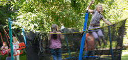 Zu unseren großen Spielgeräten zählen: eine Seilbahn, ein Trampolin, große Nestschaukel, mehrere Kletterstangen, ein Spielhaus mit Rutsche und Sandkiste, Schaukeln und eine Wippe. Reger Betrieb herrscht auf dem grünen Fußballplatz.
